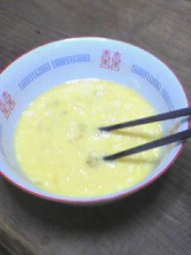 (5) 溶き卵2個くらいをかけてひと混ぜします。