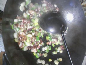 (3) 香りたった(焦がすな!)ら、(1)を投入してさっと炒めます。