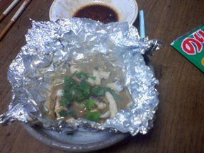 (9) ホイルの口を開けて大さじ1ぱい程の醤油をたらし、軽くはしで混ぜ、水分を飛ばしながら、さらに5分程焼いて(1)をかけたら出来上がり。