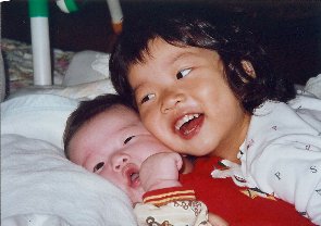 H14.05.15 最近、いつもそうですが、夜寝る時に、「おやすみ」って声を掛けると、長男は「おやちゅみ」長女は「あーおぅ」と言います。昨年、長男はふざけて「おやすみ」と言われると「おはよう」、「いただきます」と言うと「ごちとうたま」と言うように、逆の事を言って楽しんでいる時期がありました。それを覚えていたようで、今度は長女が笑って真似るようになりました。