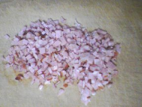 (3) 豚バラスライス肉70〜100gを細かく(パチンコ玉程度)刻みます。
