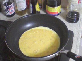 (3) 熱したフライパンに油をひき、(1)の溶卵を入れます。焼き過ぎないように注意します。1〜2人前なら、直ぐに火を切っても余熱だけでいい感じになります。