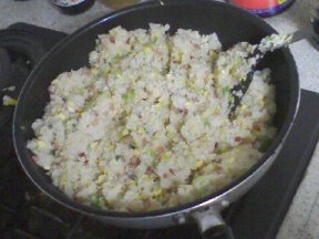 (4) くっついているのをパラパラになるように混ぜて炒め、火が通ったら、(2)を入れてひと混ぜします。