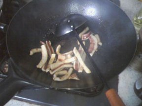 (2) 熱したフライパンに大さじ2はい程のサラダ油(オリーブ油でもok)を入れ、微塵切りにした1片のにんにくを入れます(にんにくは、干したものでもok)。