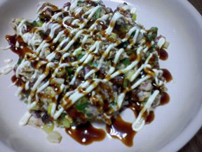 (6) すぐに(卵が半熟状態)皿に盛り付け、マヨネーズとお好み焼きソースをかけて出来上がり。