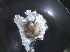 (9) ホイルの口を開けて大さじ1ぱい程の醤油をたらし、軽くはしで混ぜ、水分を飛ばしながら、さらに5分程焼いて(1)をかけたら出来上がり。