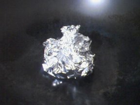 (2) 30cm×30cmのアルミホイルを器状の形にして、cのイカのワタ(3ばい分程度)を慎重に搾って取り出す(イカスミはいりません。茶色っぽい袋の中身だけ出します)。